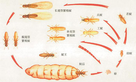 一巢成齡的臺灣乳白蟻,它們的成員有蟻皇、蟻后、兵蟻、工蟻。若蟻等。它們的結構式非常之嚴謹,品級分工清楚,蟻皇授精,蟻后產卵,兵蟻守衛,工蟻覓食勤務,若蟻待成熟長翅,分飛自立成巢。白蟻怕光,喜陰暗潮濕的環境。工蟻外出覓食,將食物消化轉換成養分,喂養巢內各品級白蟻,白蟻個體與個體之間營養均衡,相互清潔身體,相互撫慰,主要造成我們家居破壞的是工蟻——“破壞王”,它們尋找食物的半徑約100米。