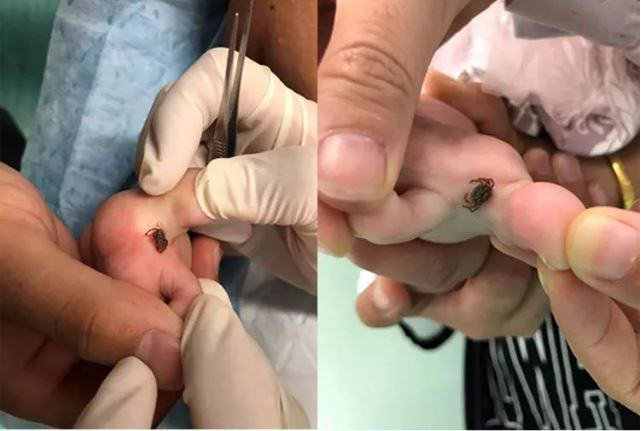 還有2歲女童光著腳在家玩,竟然被蜱蟲叮上咬進腳里,趕忙送到醫院醫治,醫生使用酒精、麻藥悶倒蜱蟲才使之松口。